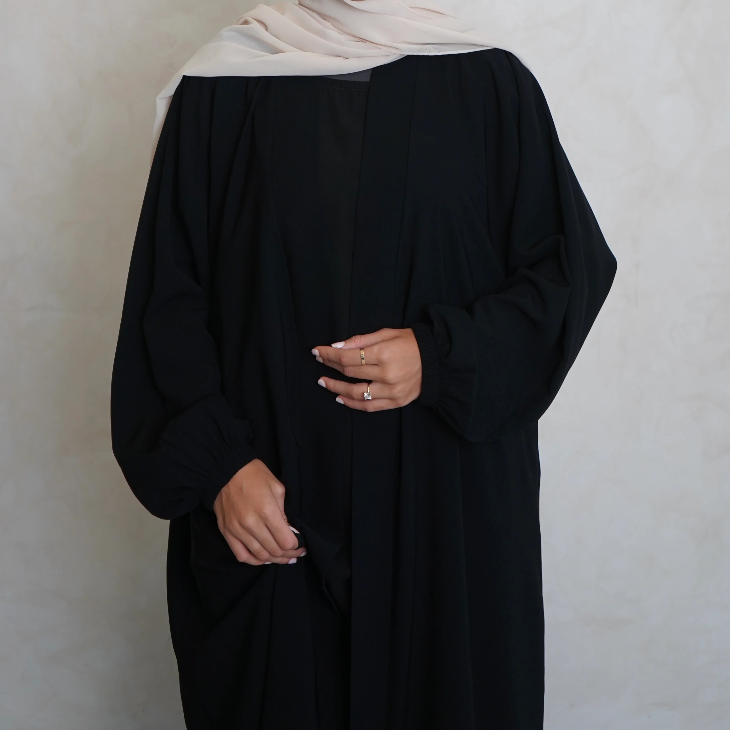 Elevate your modest fashion with our Nubo Black Two-Piece Set, featuring a chic slip dress paired seamlessly with an open abaya adorned with cuffed sleeves – a perfect blend of contemporary style and timeless modesty
