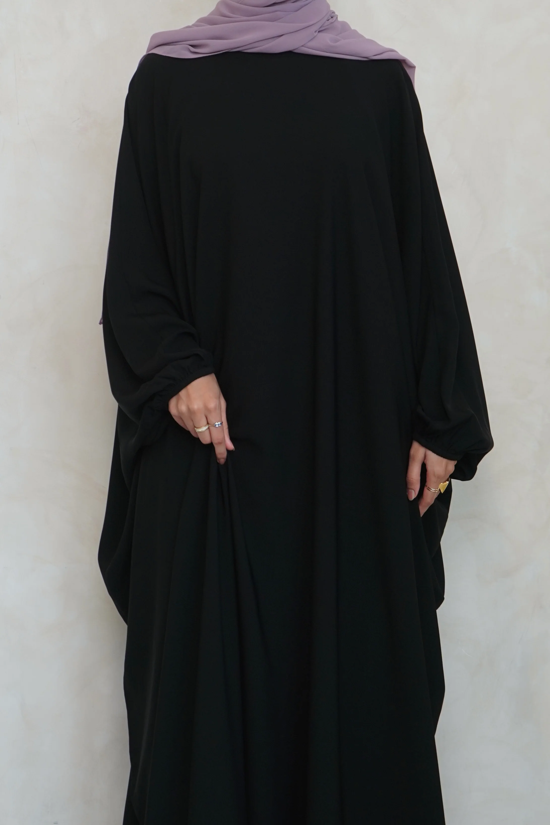 Black Batwing Jilbaya with cuffed sleeves - a perfect fusion of contemporary style and modest comfort. With its unique flowy batwing design, not only adds a touch of sophistication but also ensures breathability, making it an ideal choice for any occasion.